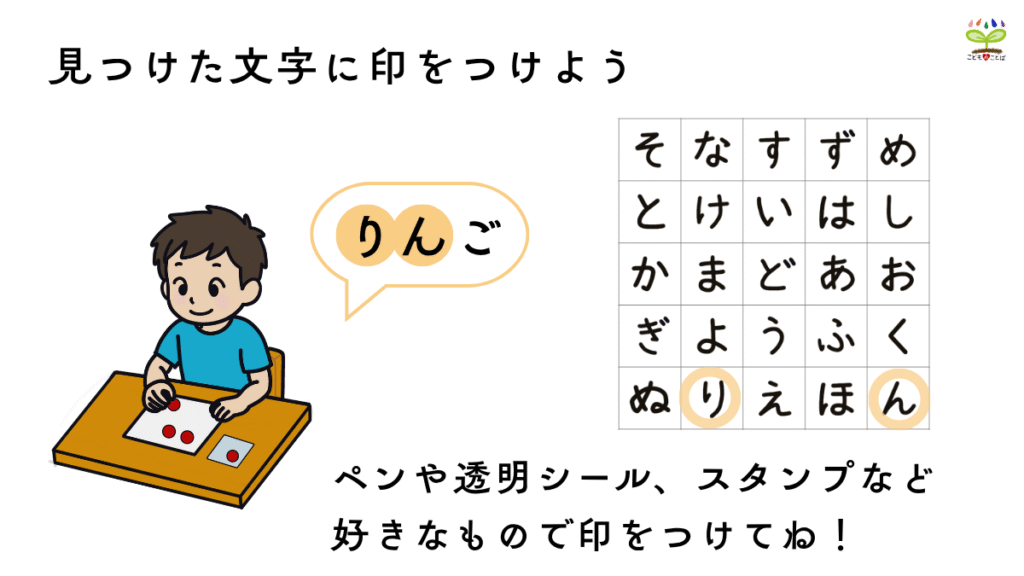 言葉の中に同じ文字があったら、そのマスを探して印をつけましょう。