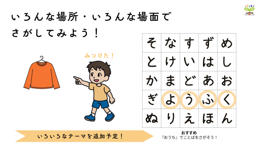 例えば『おうちで探そう』なら家にあるものを中心に、いくつかの単語が隠れています。