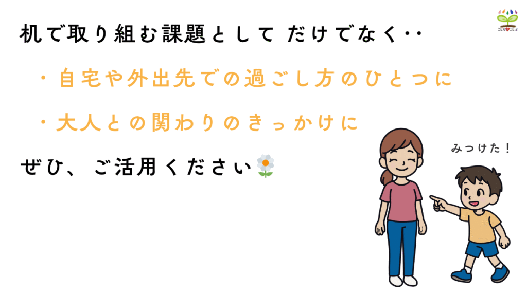 おでかけ先での待ち時間、支援・療育の場でも活用できます。